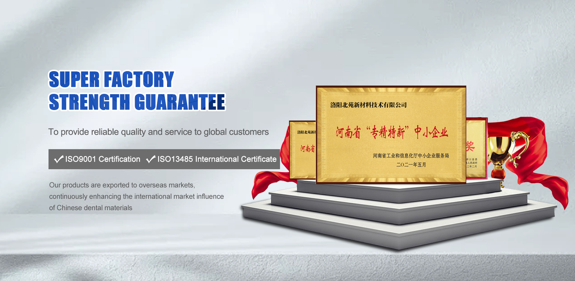 Luoyang Beiyuan Advanced Materials Technology Co.,Ltd is located on Weisi Road in Yichuan Industrial Agglomeration Zone. It was founded in 1996 in Luoyang High tech Zone and settled in Yichuan Industrial Agglomeration Zone in 2017. The company currently specializes in dental porcelain powder, zirconia blocks, investment Materials , gypsum, dental alloys, dental casting crucibles and other oral restoration materials, as well as crucibles widely used in glass glaze diamond tools and precious metal melting. It is a high market share and comprehensive manufacturing enterprise in China, providing complete solutions for more than 90% of denture processing enterprises.
